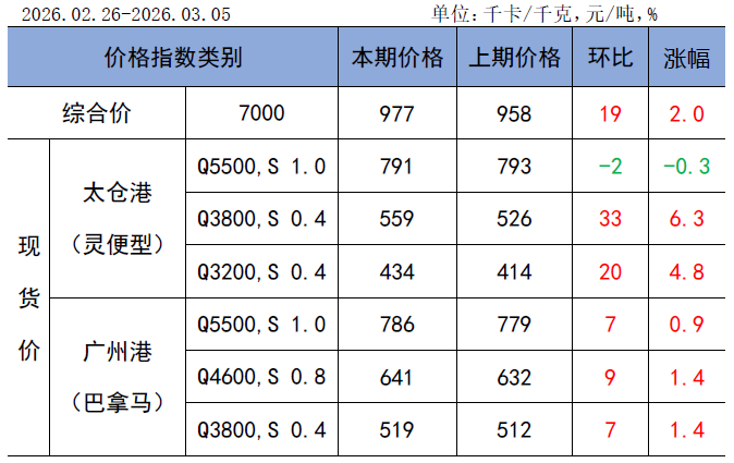 CECI进口指数到岸标煤单价为977元/吨,较上期上涨19元/吨,环比涨幅2.0%。本期各煤种采购价格除太仓港(灵便型)5500千卡/千克价格环比下降2元/吨外,均有不同程度上涨,其中太仓港(灵便型)3800千卡/千克、广州港(巴拿马型)4600千卡/千克价格环比分别上涨33元/吨、9元/吨。本周进口煤现货市场呈现“价格高企,成交冷清”特征。从采购情况看,货源供应持续偏紧,受制于供应商报价普遍偏高,流标现象较多,实际成交有限。从交货期看,本周样本交货期主要集中在3月下旬、4月上旬。