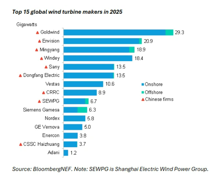 北极星风力发电网获悉,3月10日,彭博新能源财经公布了2025年全球风力发电机组排名。