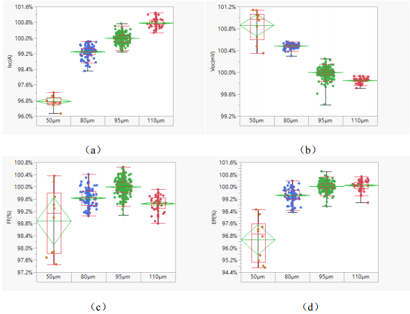 (a)(b)(c)(d)为硅片厚度与短路电流、开路电压、填充因子、电池效率关系图