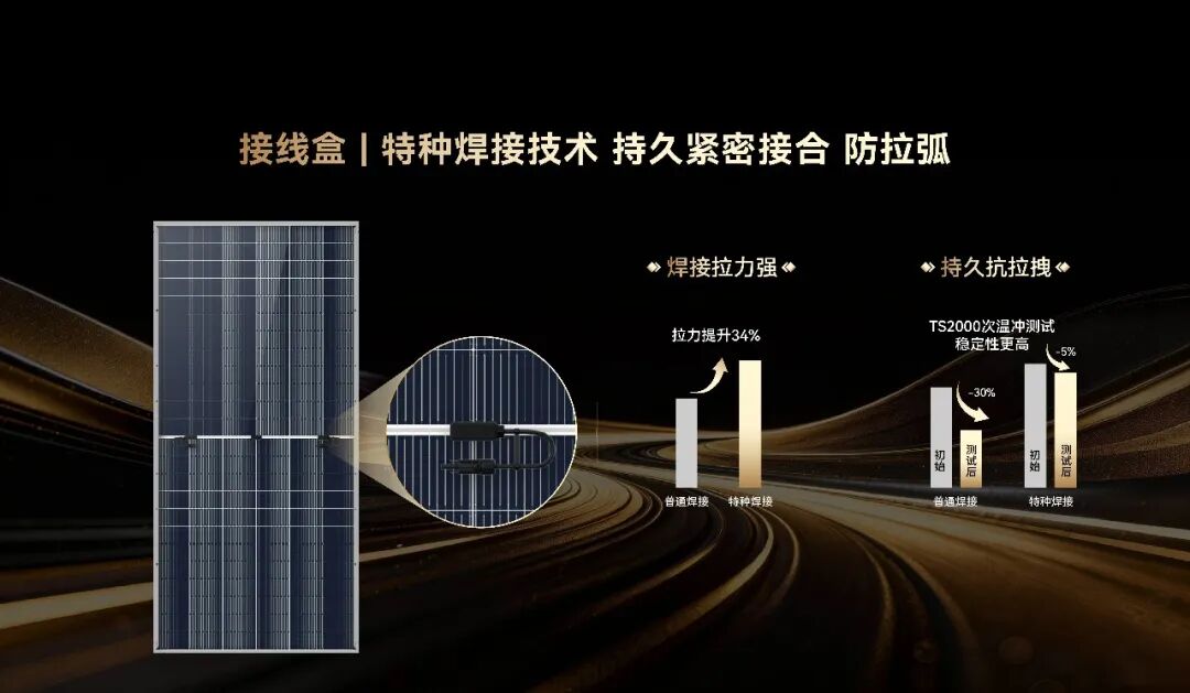 首先,引入特种焊接技术,实现微米级高精度焊接,使接线盒的焊点拉力比普通焊接提升34%;经2000次极端温冲测试后,特种焊接拉力保持率仍在95%以上,而普通焊接衰减高达30%,从源头规避了虚焊导致的拉弧风险。