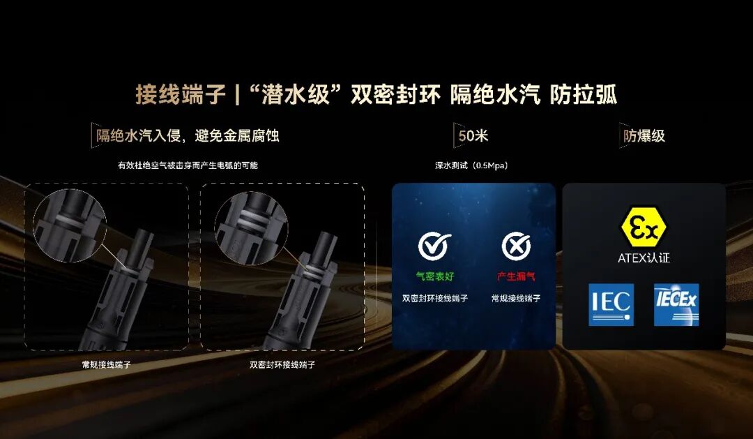 其次,采用 “潜水级”双密封环接线端子。常规单密封圈端子易因水汽入侵导致腐蚀、接触不良。Hi-MO X10的双密封圈结构,能有效隔绝水汽、腐蚀性气体,通过50米水深级气密性测试,并获得ATEX/IECEx防爆认证,从物理上杜绝空气被击穿产生电弧的可能。