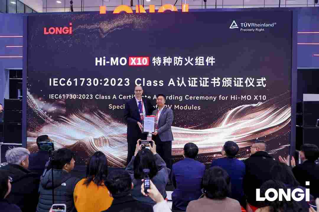 发布会上,德国莱茵TÜV为Hi-MO X10颁发国内首个完整组件Class A级防火认证。这份认证的特殊之处在于:它不是仅对单块送样组件负责的“检测报告”,而是对每一块量产组件负责的“认证证书”。