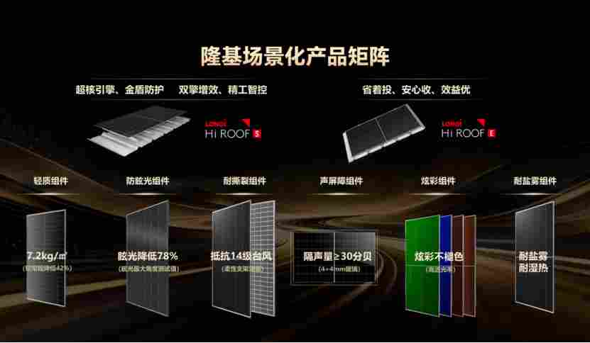 从特种防火组件到轻质防积灰、耐盐雾耐湿热、水务防撕裂、防眩光、声屏障及炫彩组件,隆基此次发布会以丰富的产品矩阵,全面覆盖各类场景的应用需求。
