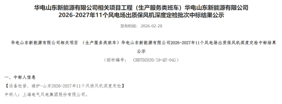 近日,电气风电成功中标华电山东新能源有限公司(以下简称:华电山东)2026-2027年11个风场的风机运维项目,服务覆盖青岛、烟台、淄博、枣庄、德州、威海、泰安等地,涉及350台风机,总装机容量720MW。