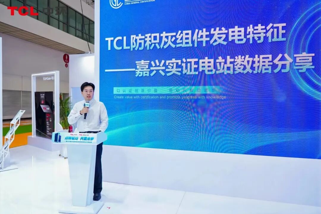 展会现场,北京鉴衡认证中心实证总监马浚翔带来《TCL中环防积灰组件发电特征——嘉兴实证电站数据分享》权威演讲,以长达6个月的真实实证数据,全方位印证TCL中环防积灰组件的卓越性能,让现场观众直观感受产品硬实力。