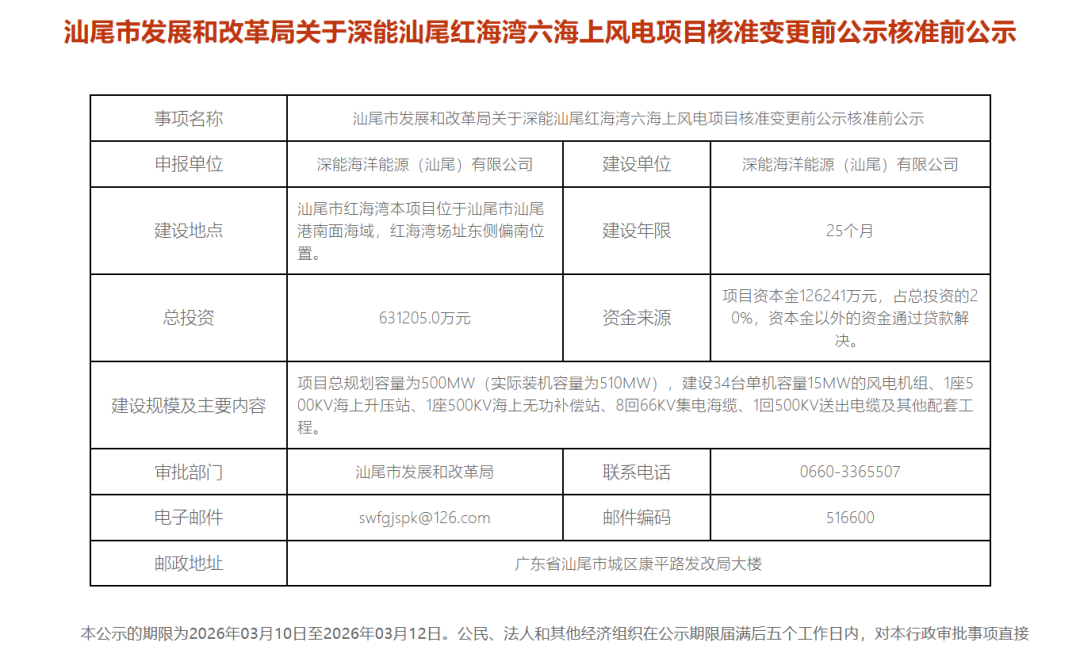 北极星风力发电网获悉,3月10日,汕尾市发展和改革局发布《关于深能汕尾红海湾六海上风电项目核准变更前公示核准前公示》。
