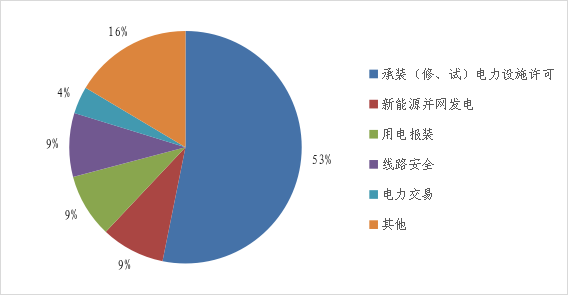 2026年2月,热线平台接收举报问题线索79件。其中,承装(修、试)电力设施许可42件、新能源并网发电7件、用电报装7件、线路安全7件、电力交易3件、其他13件(详见图3)。举报数量较多的省份为:广东11件、浙江6件、河北5件、陕西5件、湖南4件。