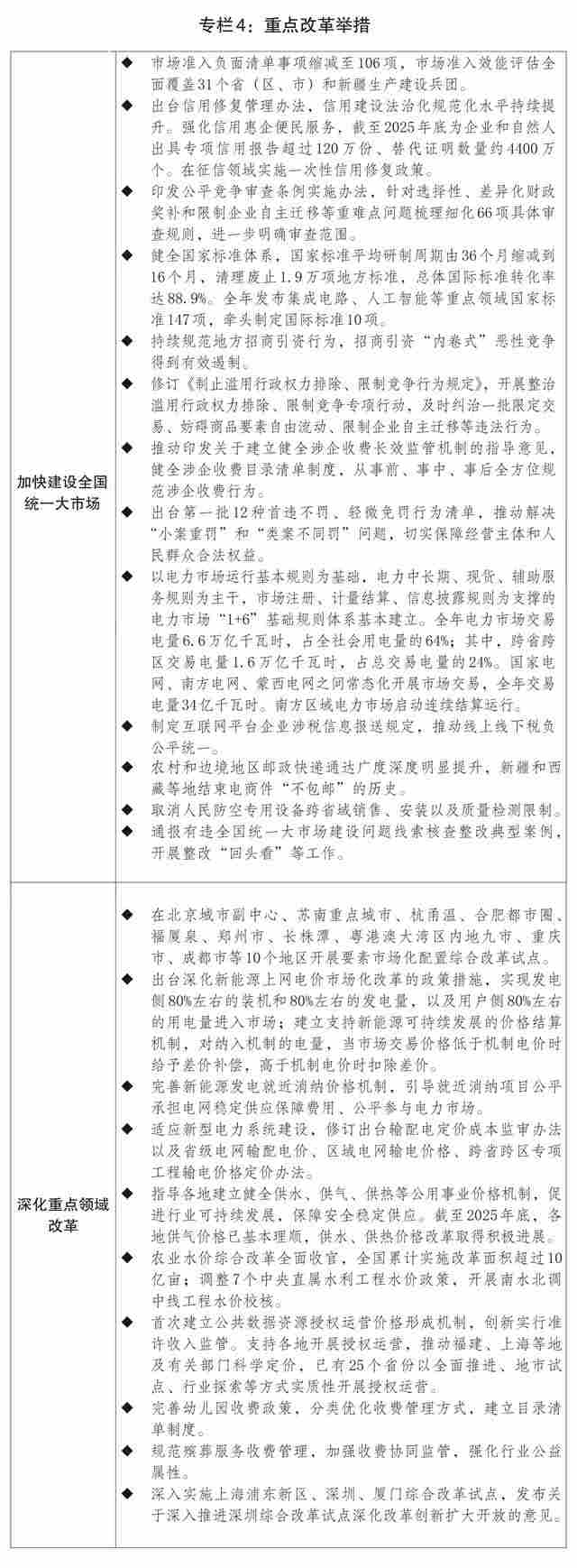 一是全国统一大市场建设向纵深推进。实施全国统一大市场建设指引,出台市场准入负面清单(2025年版),清单事项缩减至106项。深入开展市场准入壁垒清理整治行动,累计修订或废止相关文件2300余件。加快建设统一开放的交通运输市场,实施交通物流降本提质增效行动计划,市场设施联通更加高效顺畅。推动修订反不正当竞争法,出台公平竞争审查条例实施办法,开展整治滥用行政权力排除、限制竞争专项行动。持续规范地方招商引资行为,招商引资乱象得到有效遏制,地方制定实施政策的合规意识明显增强。出台健全社会信用体系的意见,构建信用修复制度,建立企业信用状况综合评价体系,全面推行以专项信用报告替代有无违法违规记录证明。全国统一电力市场体系初步建立,跨电网经营区常态化电力交易机制基本建立,电力现货市场基本覆盖全国。