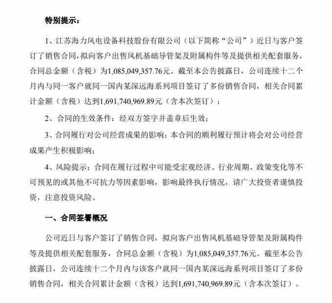 北极星风力发电网获悉,江苏海力风电设备科技股份有限公司近日发布公告,宣布与客户签订一份重大销售合同。根据合同,公司将向客户出售风机基础导管架及附属构件,并提供相关配套服务,合同总金额(含税)高达10.85亿元。
