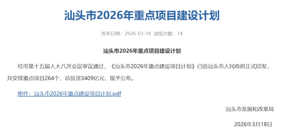 公告显示,经汕头市第十五届人大八次会议审议通过,《汕头市2026年重点建设项目计划》已由汕头市人民政府正式印发,共安排重点项目264个,总投资3409亿元。