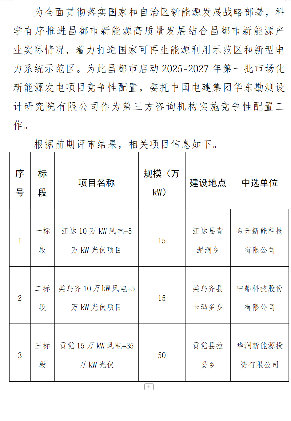 日前,西藏昌都市2025~2027年第一批市场化新能源发电项目竞争性配置结果公示,华润、中船、金开新能源三家企业中标,总规模800MW。