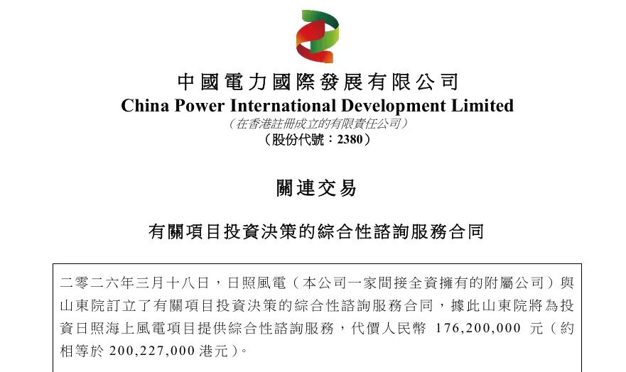 公告披露,2026年3月18日,中国电力间接全资拥有的附属公司国电投(日照)海上风电有限公司(以下简称“日照风电”)与山东电力工程咨询院有限公司(以下简称“山东院”)订立有关项目投资决策的综合性咨询服务合同,山东院将为日照海上风电项目提供综合性咨询服务,代价人民币1.76亿元。