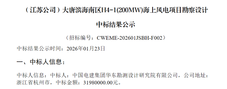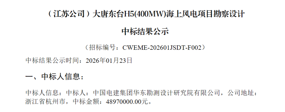 1月23日,大唐东台H5#(400MW)海上风电项目、大唐滨海南区H4-1#(200MW)海上风电项目勘察设计中标结果公示,中国电建集团华东勘测设计研究院有限公司成功中标两个项目,中标金额分别为4897万元、3198万元。