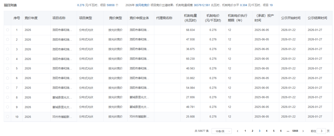 2026年按光伏竞价项目竞价出清结果:机制电量规模2796742.403兆瓦时,机制电价水平0.276元/千瓦时,项目58658个。