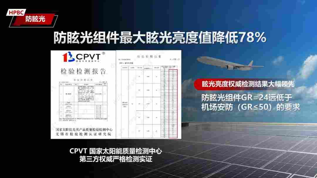 这些技术并非停留在实验室参数层面。国家太阳能光伏产品质量检验检测中心(CPVT)的实证结果显示,Hi-MO X10 的最大眩光亮度显著下降,机场机坪的眩光指数(GR)仅为24,远低于行业要求不超过50的安全阈值,为复杂交通环境下的稳定运行提供了量化保障。