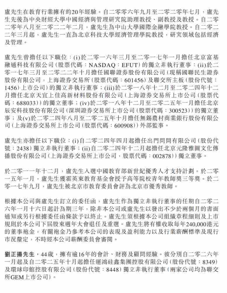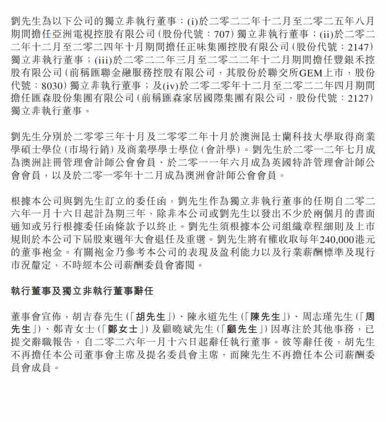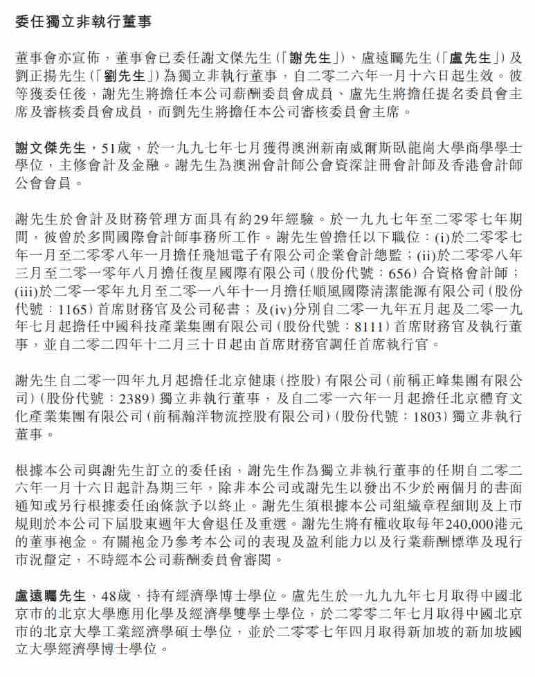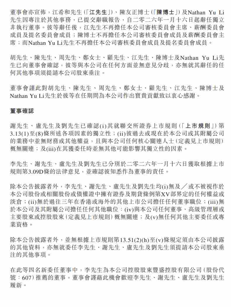 根据公司公告,原董事会主席胡吉春在内的共8名董事(含5名执行董事及3名独立非执行董事)集体辞任。同时,丰盛控股提名的李祖滨获任为执行董事并进入薪酬委员会;谢文杰、卢远瞩、刘正扬三人获任为独立非执行董事,并分别进入薪酬、提名及审核三大关键委员会,其中卢远瞩担任提名委员会主席,刘正扬出任审核委员会主席。