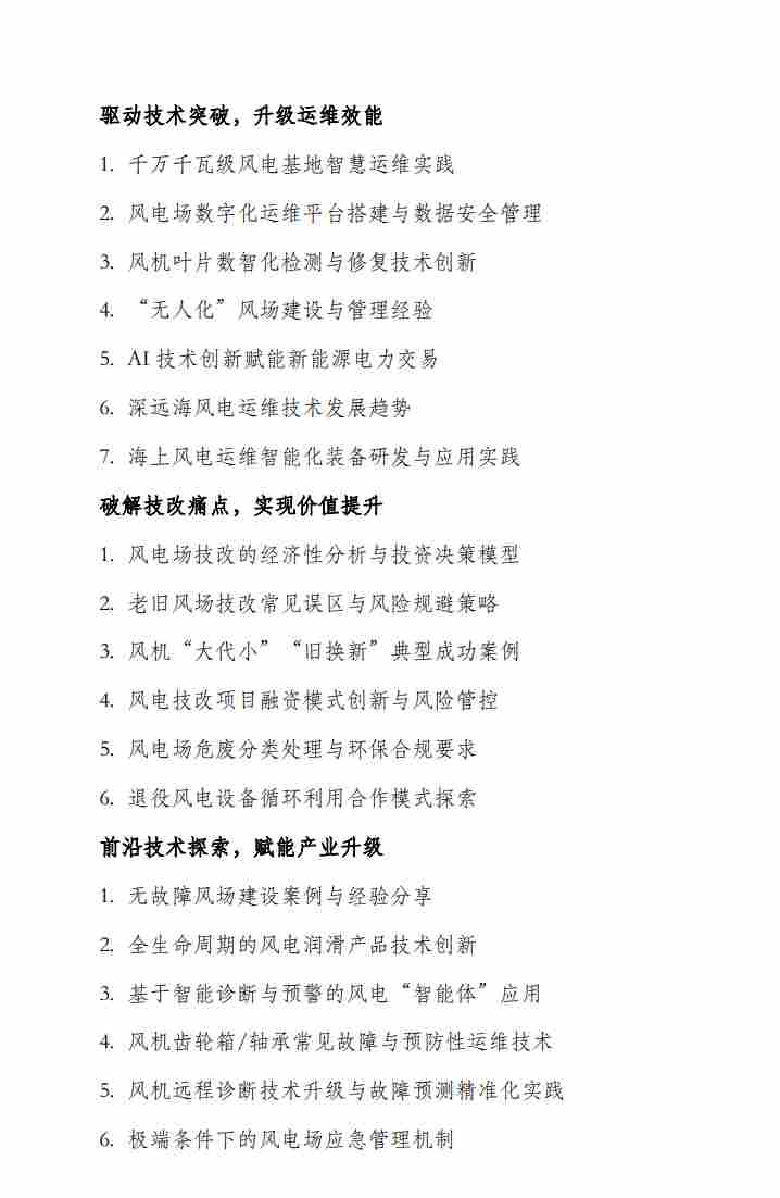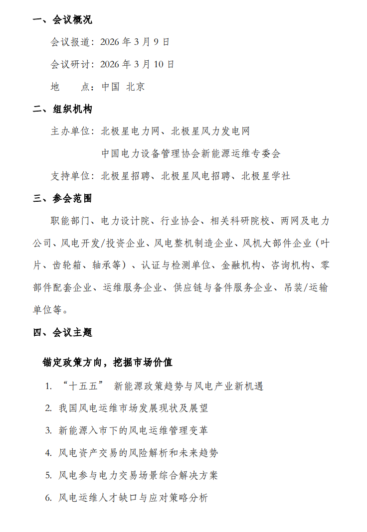 为破解行业发展难题,搭建产业协同创新平台,北极星电力网、北极星风力发电网联合中国电力设备管理协会新能源运维专委会,拟于2026年3月10日在北京举办第五届风电运维技改研讨会。会议将围绕产业发展核心需求,聚焦政策市场、技术创新、效能提升、资产管理、市场化交易等关键领域展开深度研讨,助推高效、安全、智能的运维技改市场升级,推动风电产业在“十五五”期间实现高质量跃升。