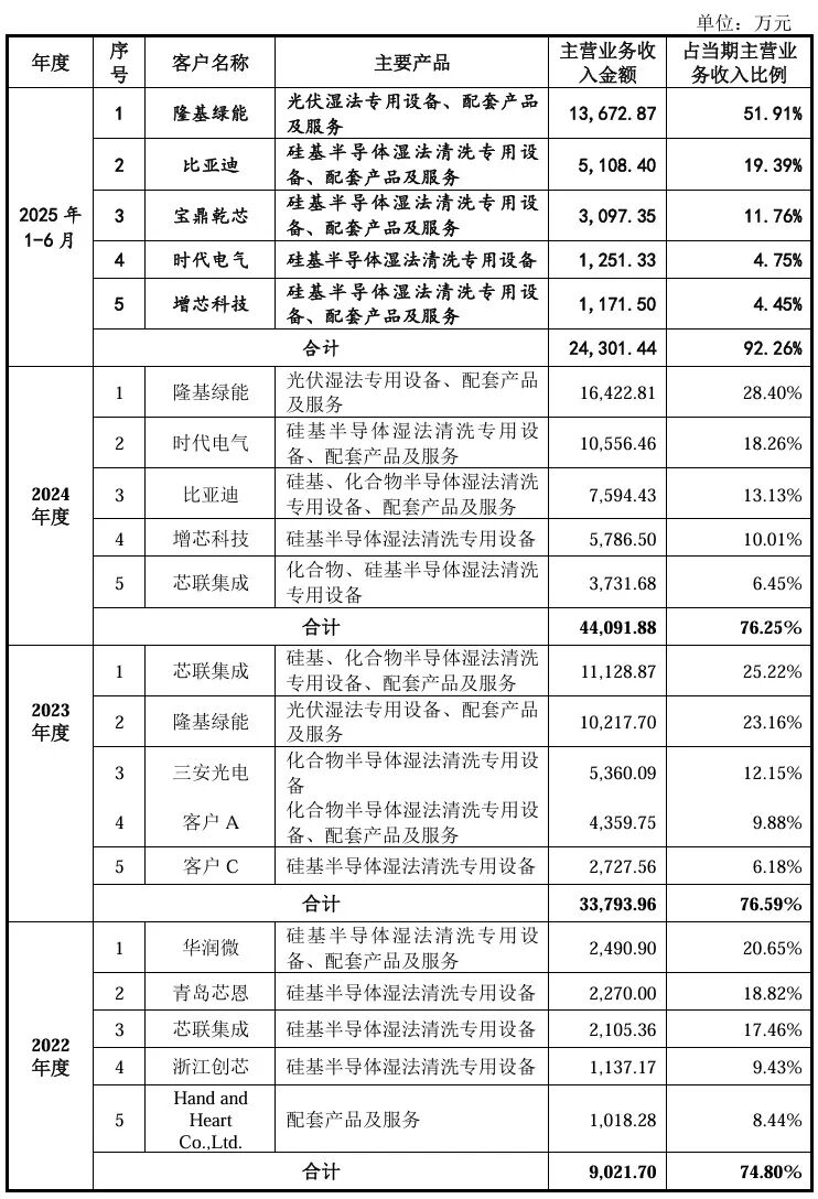 据披露,公司前五大客户销售金额占当期主营业务收入的比例分别为74.80%、76.59%和76.25%和92.26%,客户集中度较高。其中,2025年1-6月,公司向隆基绿能销售光伏湿法专用设备、配套产品及服务金额为13,672.87万元,占主营业务收入比例为51.91%,存在单一客户收入占比超过50%的情形。