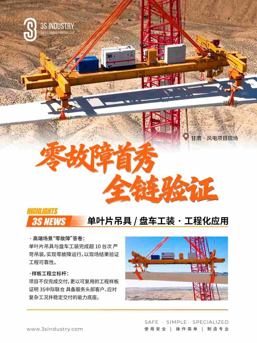 3S 中际联合长期深耕风电高空作业场景,围绕叶片吊装与机组维护等关键工序,持续打磨大部件工装产品与工程服务解决方案。