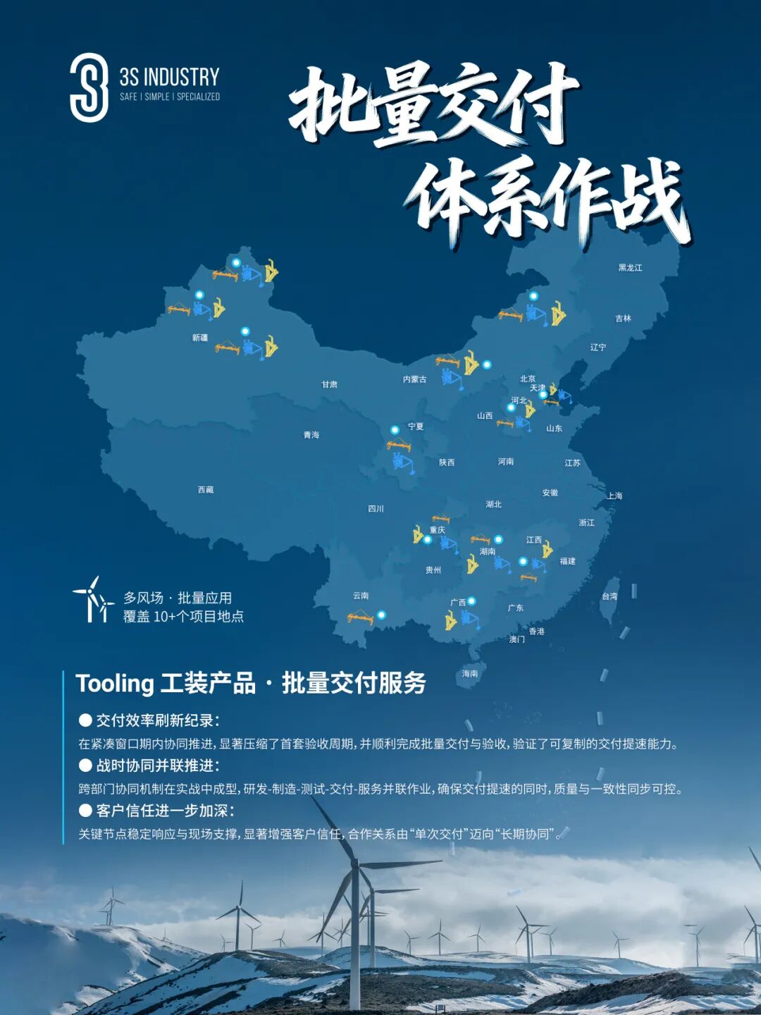 从示范验证到批量应用,工装完成的不只是项目数量的增长,更是工程能力的沉淀与放大。未来,3S 中际联合将继续以工程实践为标准,持续提升大部件工装在安全性、易用性与可靠性上的系统能力,为风电高空作业提供更加稳健、可复制的解决方案,服务于从事艰苦事业的人。