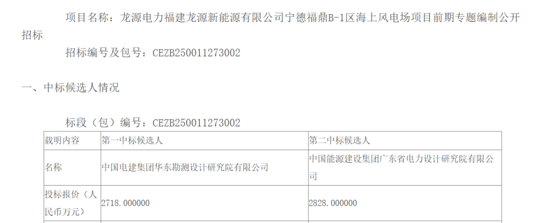 1月13日,国家能源集团发布《龙源电力福建龙源新能源有限公司宁德福鼎B-1区海上风电场项目前期专题编制公开招标项目中标候选人公示》的公告。