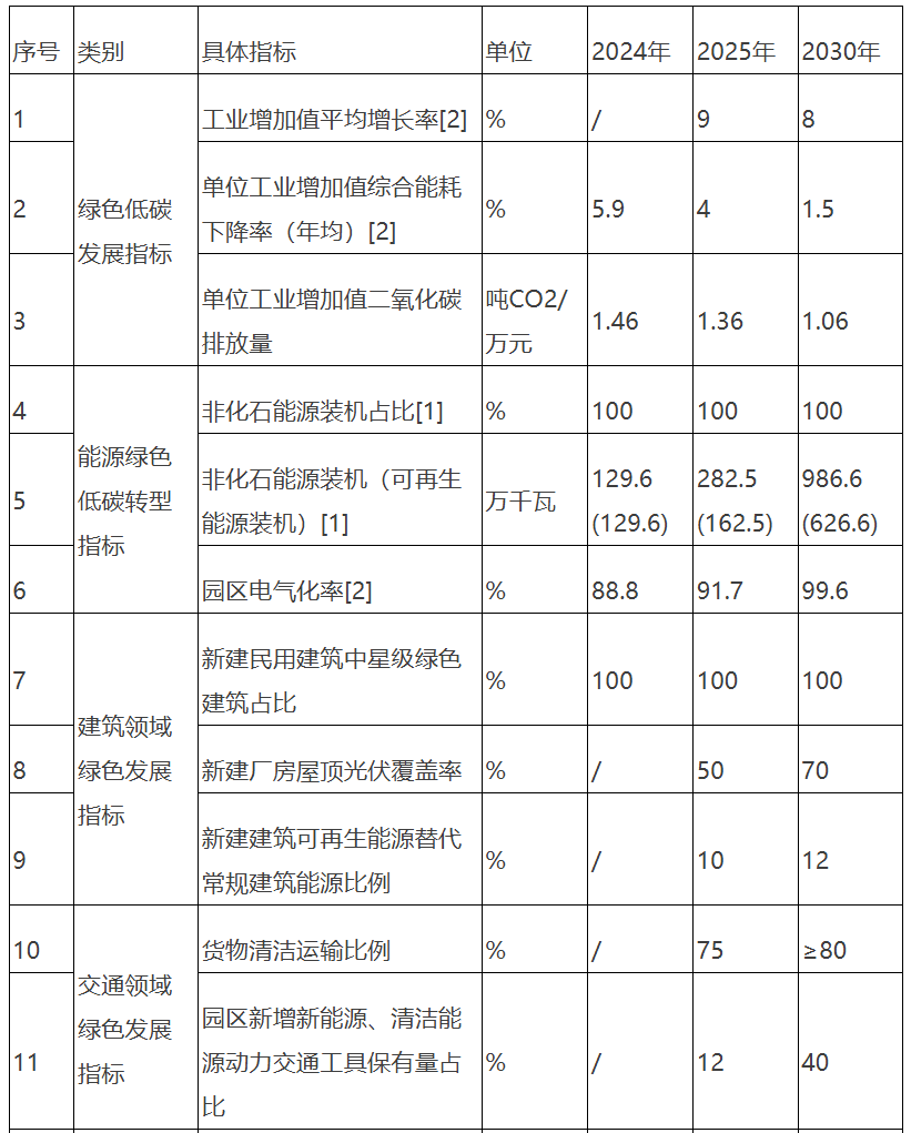 主要目标为:到2030年,产业转型提质发展格局基本形成,循环经济产业迈上新台阶,绿色低碳制度创新取得明显成效,为全国同类园区提供可复制可推广的绿色低碳转型经验做法。其中,非化石能源装机(可再生能源装机)到2030年到达到986.6(626.6)万千瓦。
