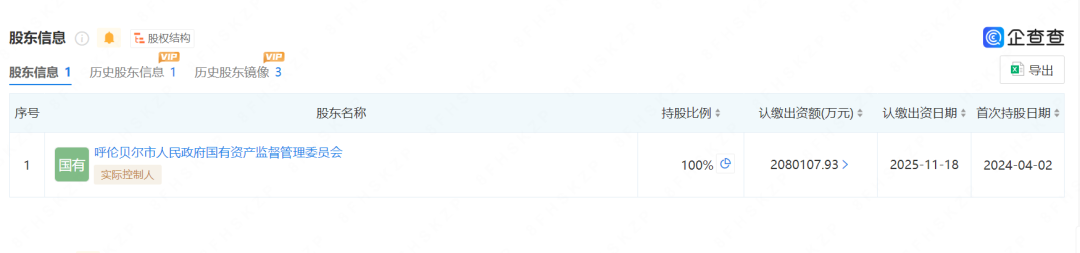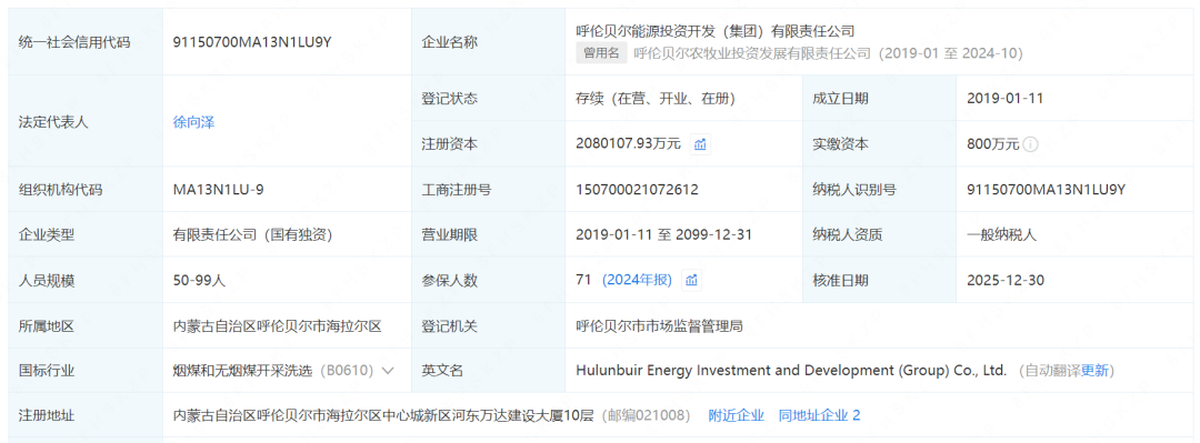 呼伦贝尔能源投资开发(集团)有限责任公司成立于2019年1月,法定代表人为徐向泽,经营范围含自有资金投资的资产管理服务、电力行业高效节能技术研发、电力设施器材制造、石油制品销售、工程技术服务、企业管理咨询、招投标代理服务、风力发电技术服务、太阳能发电技术服务等。股东信息显示,该公司现由呼伦贝尔市人民政府国有资产监督管理委员会全资持股。