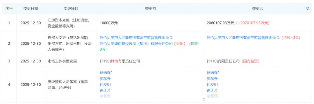 近日,呼伦贝尔能源投资开发(集团)有限责任公司完成工商变更,原股东呼伦贝尔城市建设投资(集团)有限责任公司退出,公司现由呼伦贝尔市人民政府国有资产监督管理委员会全资持股。与此同时,公司注册资本由1亿元人民币大幅增至约208亿元人民币,增幅达207倍,凸显其在能源领域持续发力的决心。