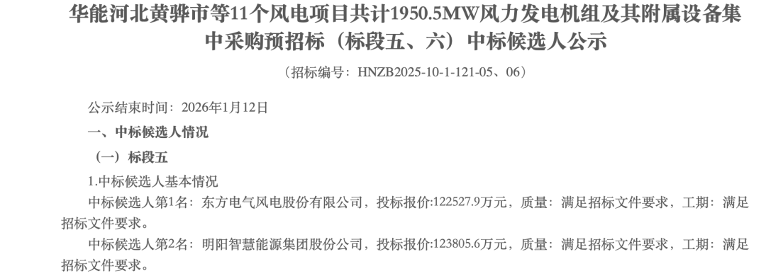 根据中标候选人公告,标段五第一中标候选人为东方电气风电股份有限公司,投标报价:122527.9万元。第二中标候选人:明阳智慧能源集团股份公司,投标报价:123805.6万元。