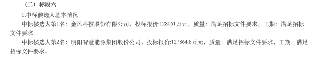 标段六第一中标候选人为金风科技股份有限公司,投标报价:128061万。第二中标候选人:明阳智慧能源集团股份公司,投标报价:127864.8万元。