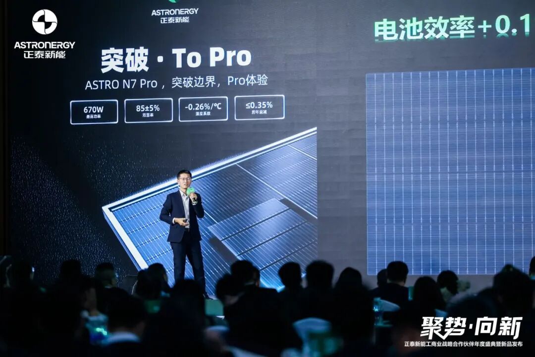 活动现场,正泰新能正式发布新品组件ASTRO N7 Pro,以“突破·To Pro 收益全面跃升”宣告正泰新能在产品效能与技术革新上的又一次重大突破。ASTRO N7 Pro旨在突破传统组件的能效边界,以670W超高功率与24.8%卓越效率,为客户带来从产品到体验的全面升级。