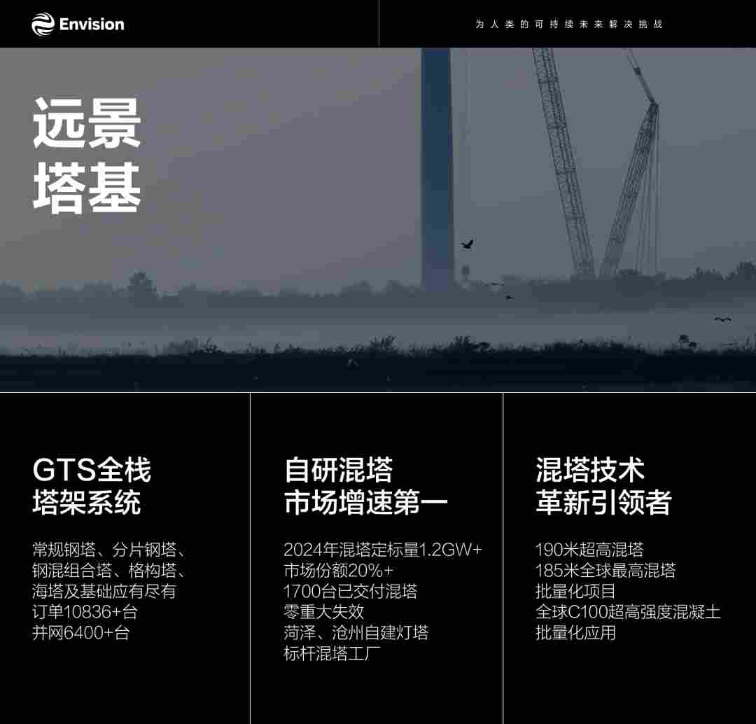 在混塔领域,2024年远景自研混塔定标量已超1.2GW,市场份额突破20%,实现市场增速第一,已交付的1700台混塔保持零重大失效。目前,远景在菏泽、沧州均自建 “灯塔工厂”,为混塔制造树立了行业标杆,形成了高效、智能、可复制的生产模式。作为混塔技术革新的引领者,远景成功打造了全球最高的190米混塔,并实现185米混塔的批量化交付;率先在全球范围内实现C100超高强度混凝土的批量化应用,不仅突破了材料和工艺的极限,也显著提升了塔架的结构性能和寿命。