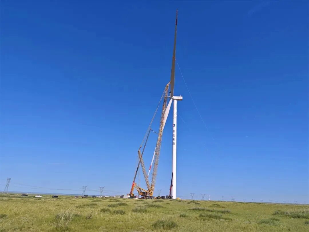 京能锡盟特高压外送新能源三期40万千瓦风电项目位于内蒙古自治区锡林郭勒盟阿巴嘎旗查干淖尔镇,项目采用32台中船科技10MW机组。自项目建设大幕开启后,中船科技项目团队便锚定目标全速推进。5月,设备供货工作如期启动,6月,首台机组开始吊装,10月圆满完成全场机组吊装任务,在广袤的草原上书写了新能源建设的“加速度”答卷。