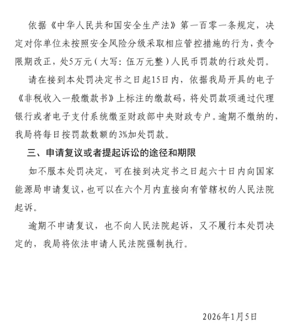 近日,国家能源局华东监管局发布行政处罚决定书:三峡能源安徽临泉县黄岭150MW风电场项目的施工单位,对危险性较大工程专项施工方案管理不到位,未按规定开展编、审、批或专家论证,未采取有效措施降低安全风险,未按照安全风险分级采取相应管控措施。责令限期改正,处5万元(大写:伍万元整)人民币罚款的行政处罚。