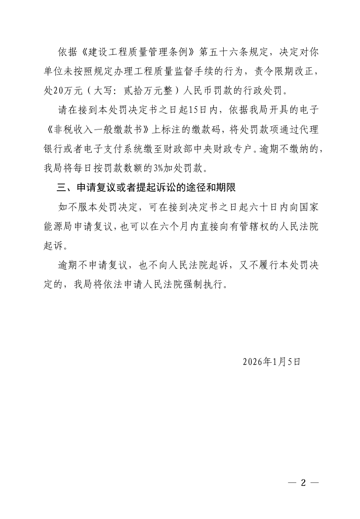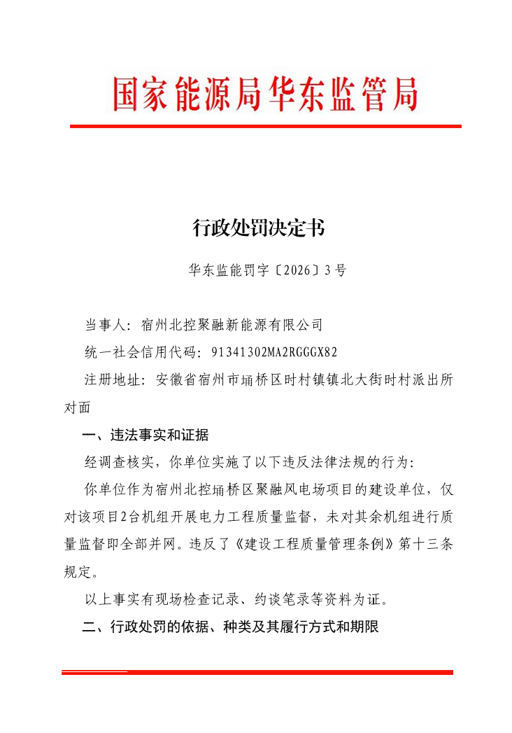 文件显示,宿州北控聚融新能源有限公司作为宿州北控埇桥区聚融风电场项目的建设单位,仅对该项目2台机组开展电力工程质量监督,未对其余机组进行质量监督即全部并网,违反了《建设工程质量管理条例》第十三条规定,责令限期改正,处20万元罚款的行政处罚。