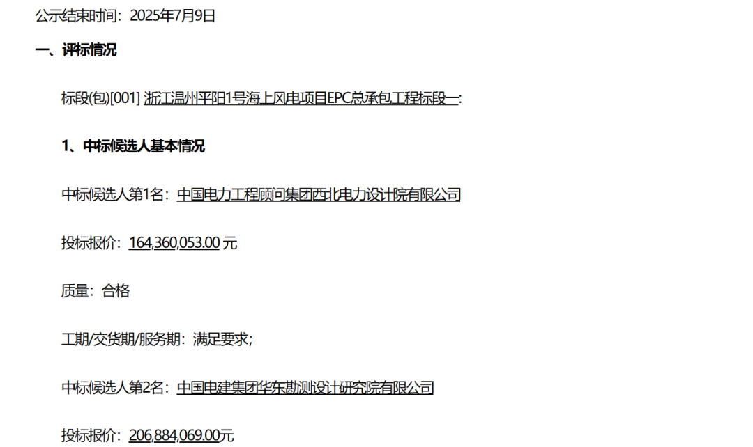 据悉,浙江温州平阳1号海上风电项目EPC总承包工程标段一为陆上集控中心EPC总承包工程。该标段中标结果早在2025年7月11公布,由中国电力工程顾问集团西北电力设计院有限公司中标,中标价格为164,360,053.00元。