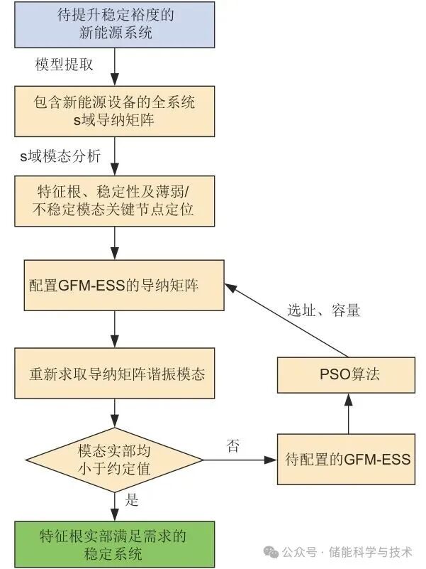 GFM-ESS的正阻尼可以抵消由跟网型设备引起的负阻尼,从而抑制谐振,故可通过配置GFM-ESS以提高电力系统稳定裕度。本部分内容提出一种深度融合s域模态分析理论和PSO算法的GFM-ESS的优化配置方法。