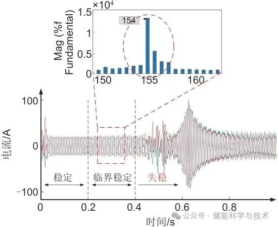变流器并网结果如图4所示,由仿真图可知,在0~0.2 s内,变流器并网稳定;0.2~0.4 s处于临界稳定状态,并网电流波形呈等幅谐振状态,且FFT分析结果显示电流形成以154 Hz为中心的谐振峰,对应特征根求取结果;0.4 s后逆变器开始发散失稳,对应特征根实部为正的求取结果。