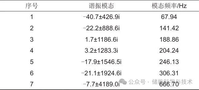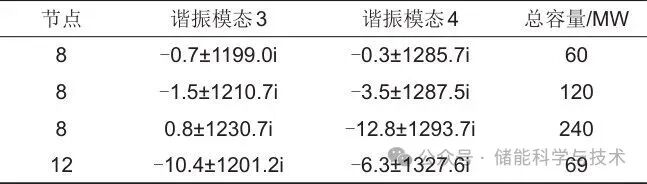 按照上述配置结果,在节点6和节点12配置对应容量的GFM-ESS,再重新计算全系统导纳矩阵行列式特征根,得到系统谐振模态如表3所示。