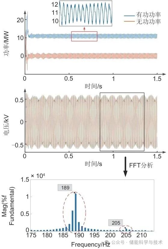 与上述求解结果相对应,图7中的功率波形图显示出发散失稳现象,对应系统存在实部大于零的谐振模态。进一步的FFT分析结果表明,系统在189 Hz和205 Hz附近出现明显的谐振峰,分别对应振荡频率为188.86 Hz和204.24 Hz的2个不稳定谐振模态,这验证了基于s域导纳矩阵求解系统谐振模态的准确性。