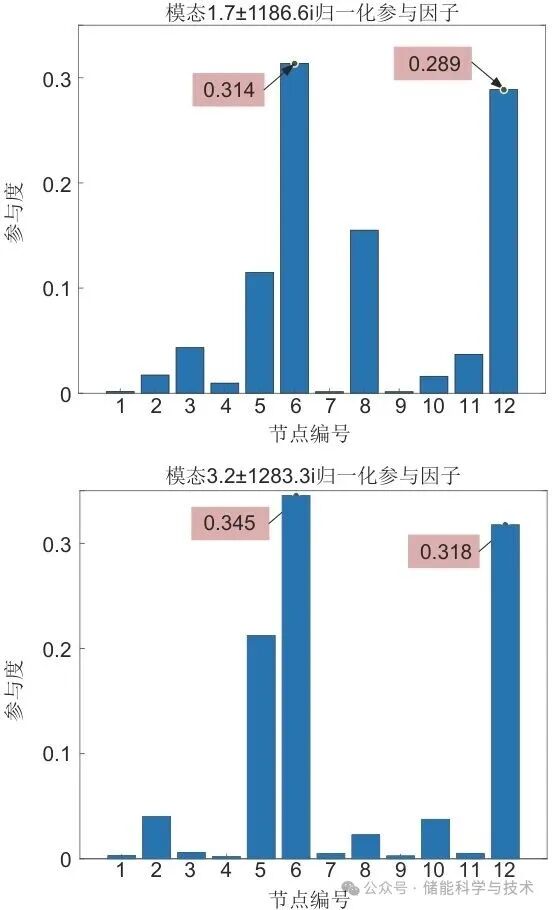 对上述不稳定谐振模态进行模态分析,并计算其归一化参与因子,结果如图8所示。对于谐振模态1.7±1186.6i,参与度最高的节点依次为节点6、节点12和节点8。当将归一化参与因子之和大于0.5作为阈值时,该模态的关键节点为节点6和节点12。对于谐振模态3.2±1283.3i,主要影响节点为节点6、节点12和节点5,同样在阈值0.5的情况下,关键节点仍为节点6和节点12。该阈值可根据网络结构灵活调整。在当前的12节点新能源系统中,2个不稳定模态均以节点6和节点12为关键节点,因此将其作为待定节点,参与后续的GFM-ESS优化配置。