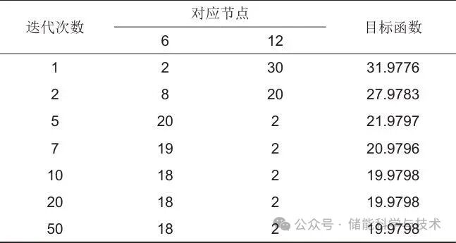 在满足所有模态实部均小于-6的稳定裕度要求的前提下,本研究将GFM-ESS的容量定为3 MW,并引入PSO算法开展循环寻优。在优化过程中,不断调整节点6与节点12上GFM-ESS的容量分配,每次调整后均重新构建系统的s域导纳矩阵,并计算1~1000 Hz频段内的谐振模态,以检查是否满足稳定裕度要求及计算目标函数。设置PSO算法粒子群规模为30,最大迭代次数为50,并设置初始配置容量为150 MW,最终目标函数收敛至19.9798。