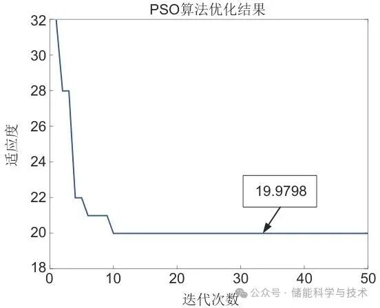 图9中,纵轴表示适应度值(即目标函数值),横轴为迭代次数。可见,PSO算法在前10次迭代内目标函数值迅速下降,表明粒子群在初期阶段已高效逼近最优解。此后,适应度曲线逐渐趋于平稳,并在第10次迭代后收敛至全局最优值19.9798,这验证了所构建的优化模型具备良好的收敛性与稳定性。