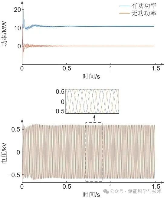 可见,经过PSO优化配置后,原本不稳定的2个谐振模态1.7±1186.6i和3.2±1283.3i变为实部满足稳定裕度要求的-10.4±1201.2i和-6.3±1328.3i。配置GFM-ESS后的仿真结果如图10所示。在大约0.5 s之后,系统稳定运行,不存在发散失稳状态,证实了上述优化结果的正确性。
