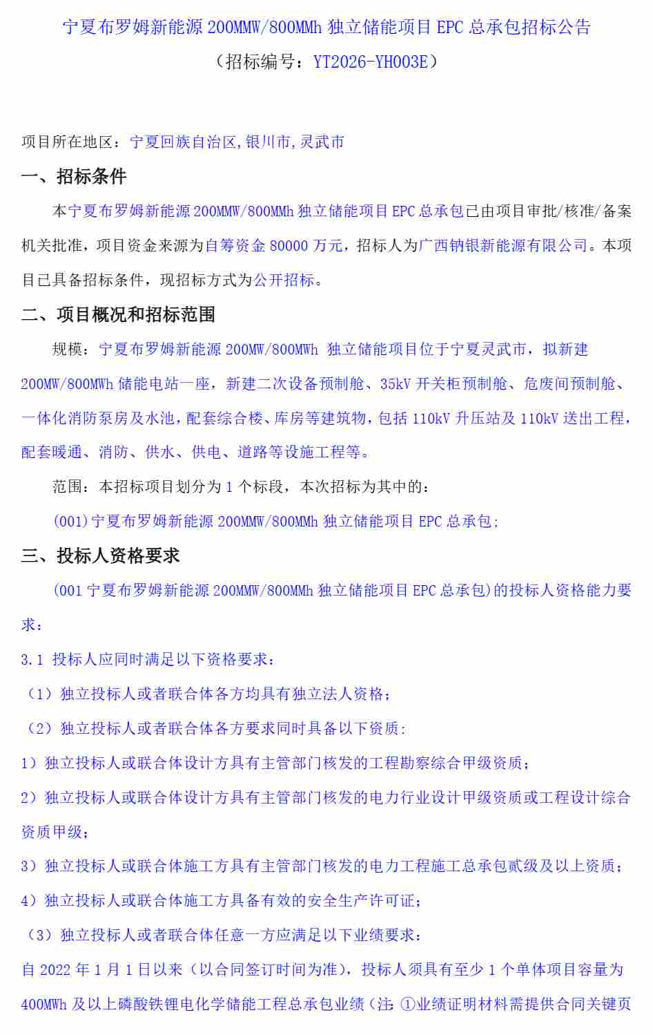 其中宁夏布罗姆新能源200MMW/800MMh独立储能项目,位于宁夏灵武市,招标人为广西钠银新能源有限公司。