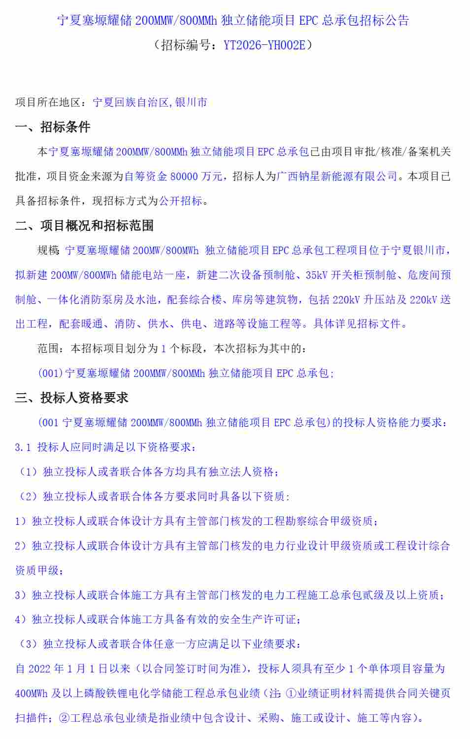 宁夏塞塬耀储 200MMW/800MMh独立储能项目,位于宁夏银川市,招标人为广西钠星新能源有限公司。
