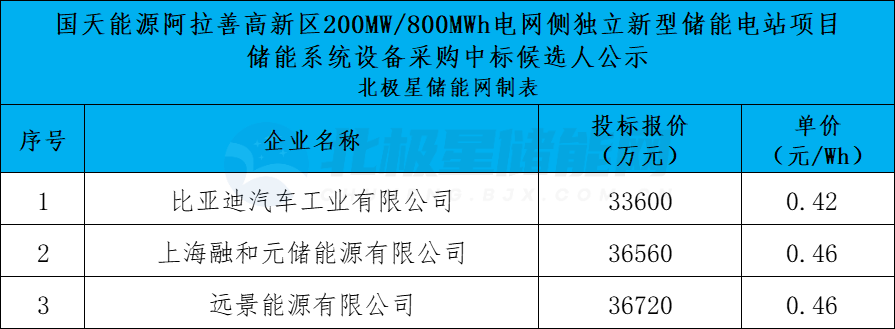 中标候选人第1名:比亚迪汽车工业有限公司,投标报价:33600万元,合单价0.42元/Wh;