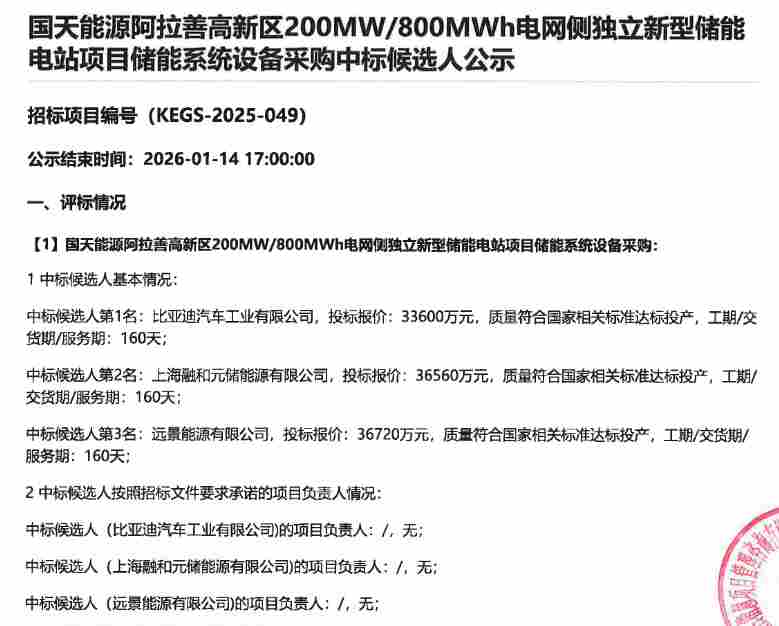 北极星储能网讯:2026年1月9日,国天能源内蒙古阿拉善高新区200MW/800MWh电网侧独立新型储能电站项目储能系统设备采购中标候选人公示,中标候选人前三名分别为比亚迪汽车工业有限公司、上海融和元储能源有限公司、远景能源有限公司。