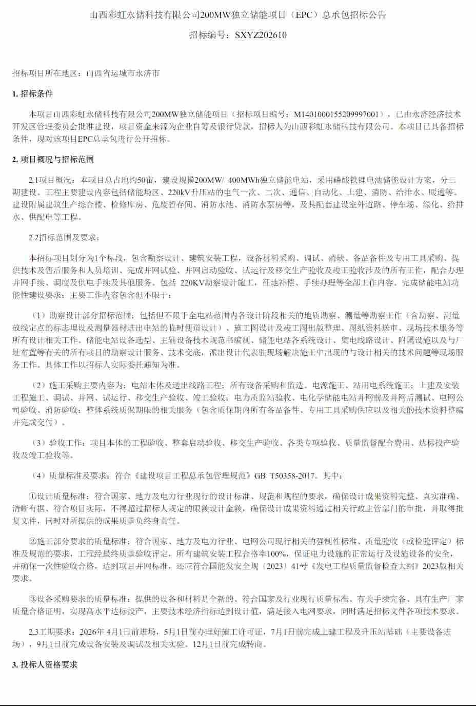 北极星储能网讯:2026年2月3日,山西两大独立储能项目EPC开启招标,总规模400MW/800MWh。