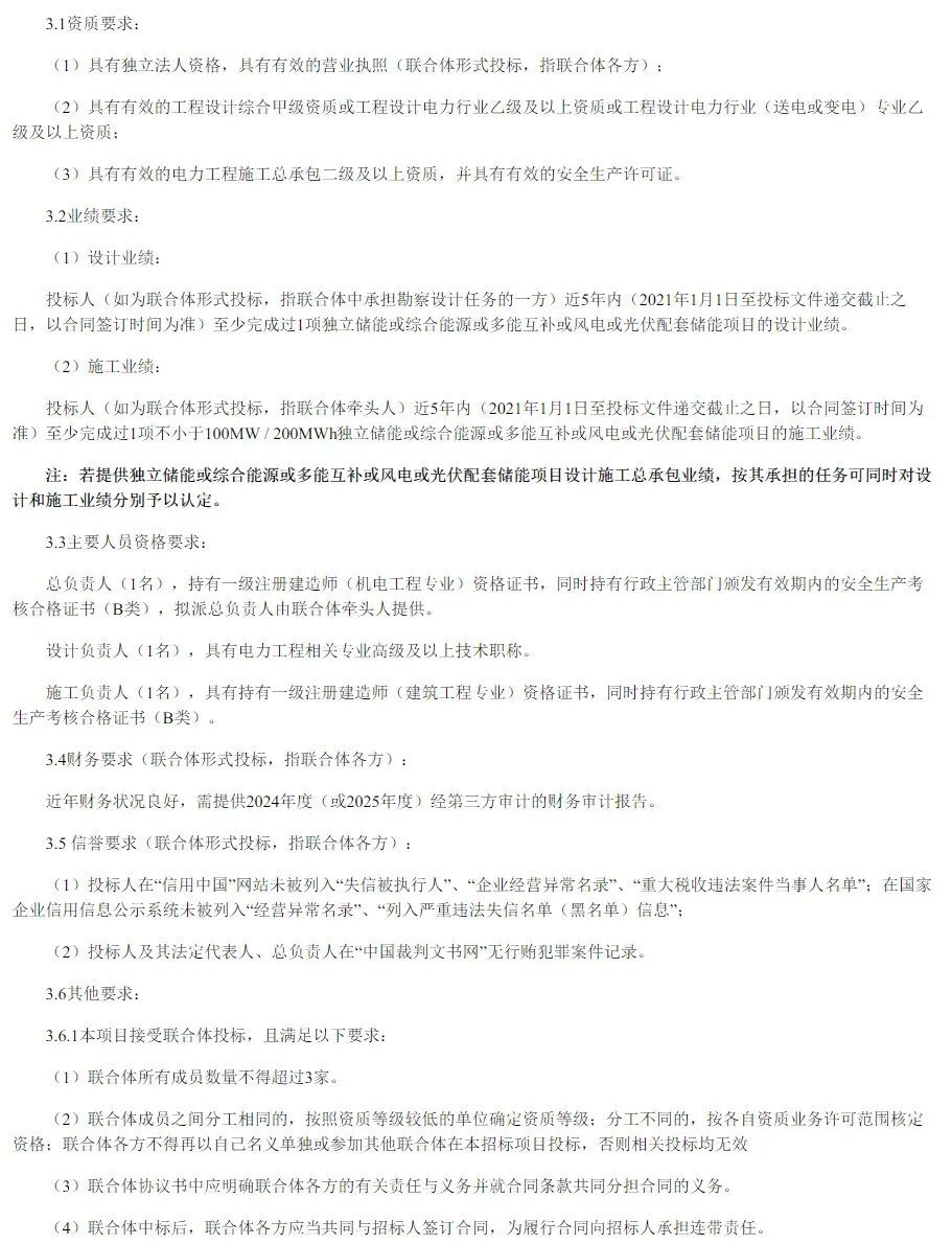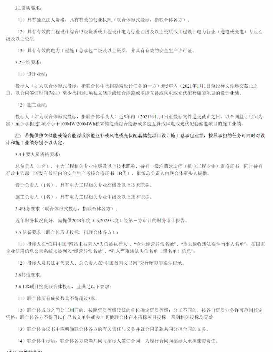 两个项目均要求投标人近5年内至少完成过1项独立储能或综合能源或多能互补或风电或光伏配套储能项日的设计业绩;近5年内至少完成过1项不小于100MW/200MWh独立储能或综合能源或多能互补或风电或光伏配套储能项日的施工业绩。且接受联合体投标,须满足相关条件。